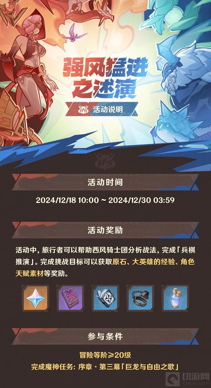 以上就是《原神》新活动「强风猛进之述演」的活动说明啦!活动即将开启,不知道小伙伴们是不是跃跃欲试了?如果这篇攻略对你有帮助,还请点个收藏关注一下切游网,各位读者的支持就是我们持续更新的最大动力。
