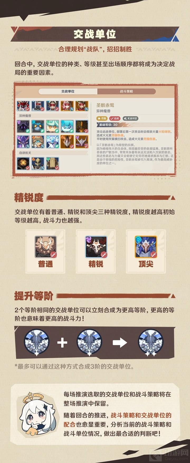 交战单位有普通、精锐和顶尖三种精锐度,精锐度越高初始等级越高,战斗力也越强。两个一阶合成一个二阶;两个二阶可以合成一个三阶。