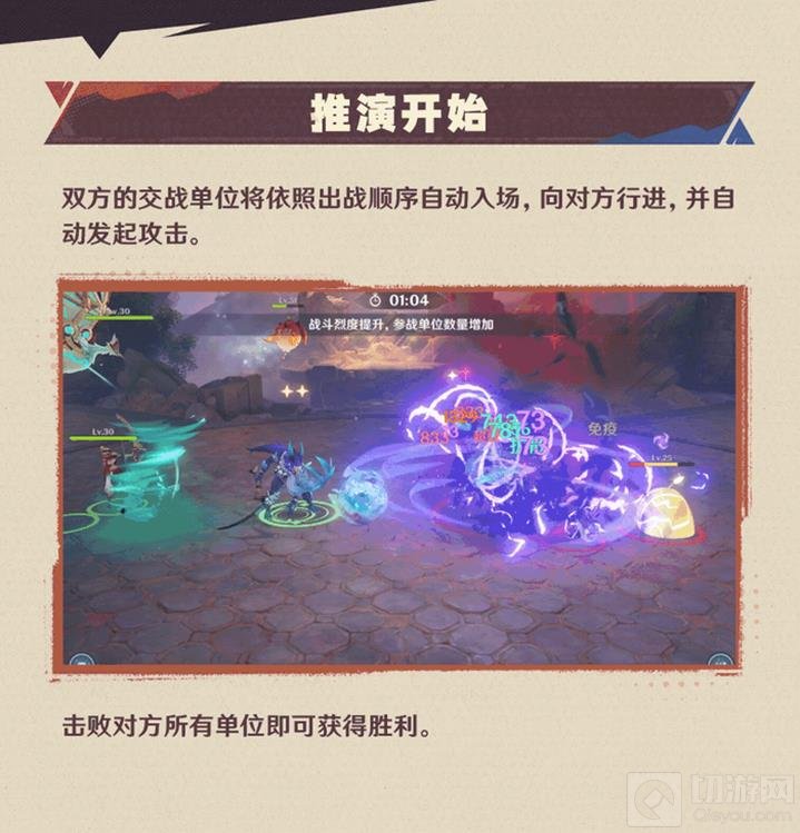 双方的交战单位将依照出场顺序自动入场,向对方行进,并自动发起攻击。击败对方所有单位即可获得胜利。