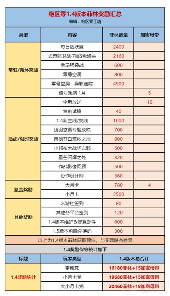 保守统计1.4版本奖励如下:零氪党:预计可得16180菲林+15加密母带,折算后合计可获得专票116抽。小月卡党:预计可得19680菲林+15加密母带,折算后合计可获得专票138抽。大小月卡党:预计可得20460菲林+19加密母带,折算后合计可获得专票146抽。
