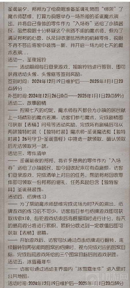 活动内容:玩家参与活动即可赢取奖励,包括独特时装【魔术师-圣诞魔法】或【26号守卫-圣诞雪怪】(二选一)以及独特家具【圣诞袜装饰】等。