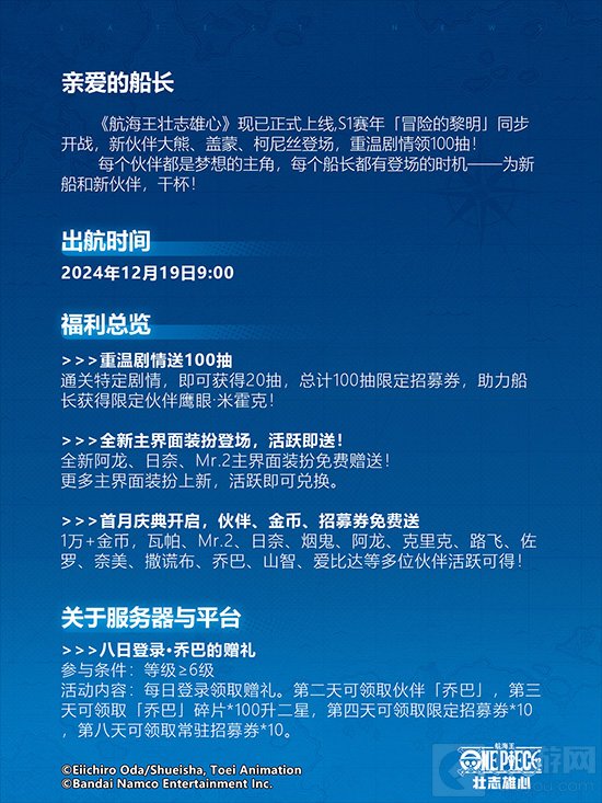 《航海王壮志雄心》现已正式上线,S1赛季「冒险的黎明」同步开战,新伙伴大熊、盖蒙、柯尼丝登场,重温剧情领100抽!