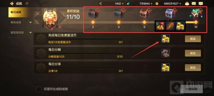 每日成就:完成所有每日任务后,普通奖励和宝箱奖励总计可得53万金币。