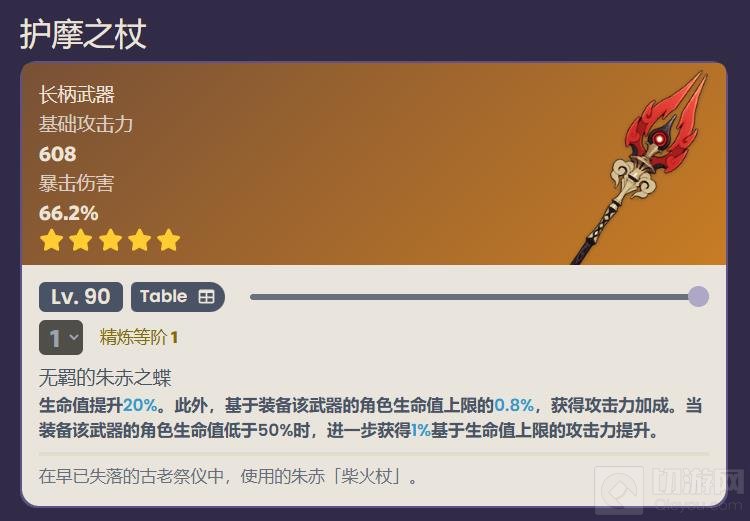 护摩之杖 护摩之杖提供的暴击伤害与基于生命值的攻击力加成,使其成为阿蕾奇诺的极佳选择。但由于阿蕾奇诺的治疗机制常导致满血,部分属性会受到限制。