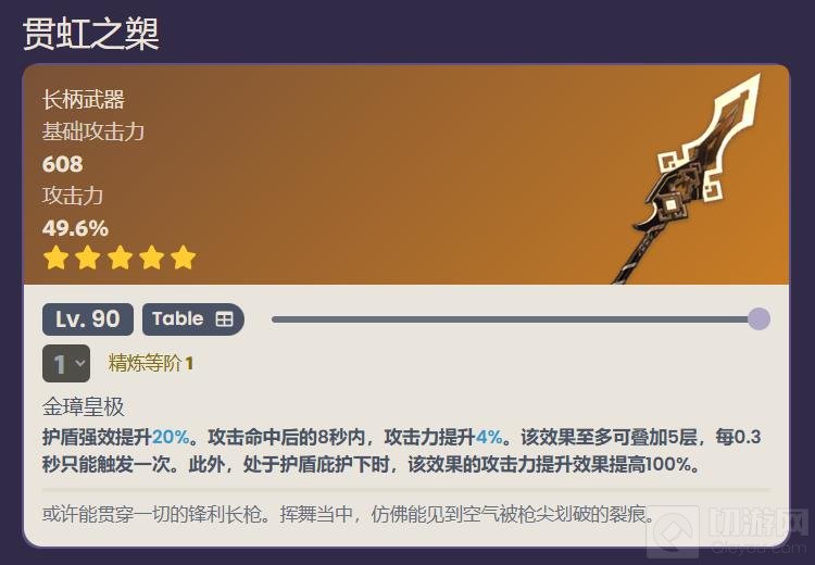 贯虹之槊 贯虹之槊在搭配护盾角色时能提供额外攻击加成和伤害加成,但无护盾支持时性价比稍逊。一般情况下除非没有决斗之枪否则不推荐这个。