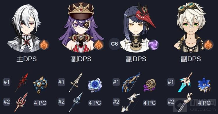 - 玩法解析:阿蕾奇诺作为蒸发队的主C,配合夜兰的水元素攻击能够快速触发蒸发反应。班尼特提供攻击加成,而钟离则提供抗打断和减抗,从而使得输出流程变得顺滑。