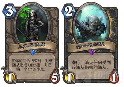 刚开始看到这张卡的时候我就很关注他的效果,潜行每回合还能生一个算是不错,起码效果都是正的。但在整理橙卡的时候我才发现原来这是张橙卡属性,对此我表示由衷的惊叹。说实话,给这张牌以橙卡属性确实不太够格。我们可以最明显的对比一个栗子——小鬼召唤师。同样的费用,相似的特性,但是一个潜行11,一个正常14,一个橙卡属性,一个蓝卡属性。在如今节奏要求重要的炉石环境中,这张牌实在是太慢了,并且本体还不能轻易出来,即便不出来,其一血的身材随便一个AOE就会被打掉,最终落得一个逗逼橙的下场,这倒是与耐心的刺客一样。看来这仿佛一蓝一紫的结合铸造了其橙卡的属性。
