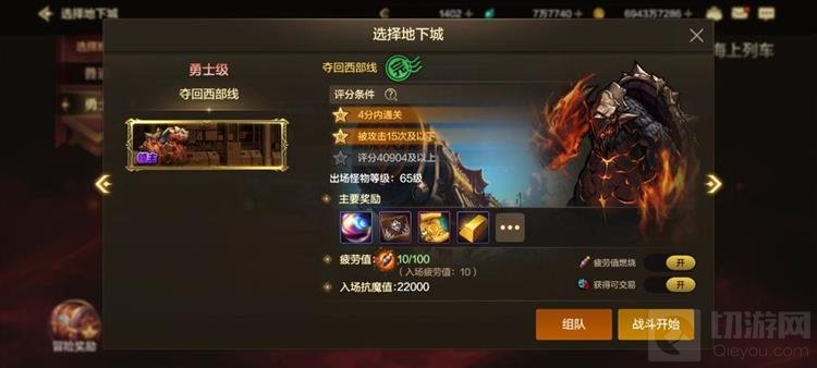 DNF手游中,勇士级副本的入场条件要求抗魔值22000以上,固定消耗10点疲劳值。开启燃烧疲劳值可享受双倍收益,消耗20点疲劳值。勇士级副本地图数量较少,通关效率更高,且除了常规材料掉落外,还额外增加“莫斯匹斯的金锭”和“幸运符碎片礼盒”。金锭可直接出售获取金币,幸运符碎片可合成幸运符。