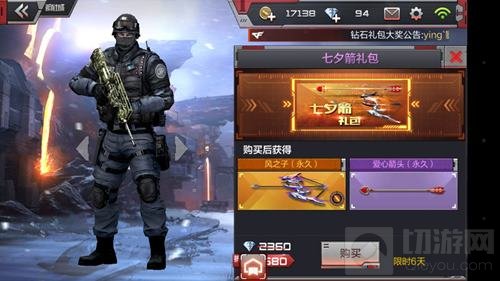 七夕来临,CF手游中也推出了七夕新武器,除此之外,还有一个七夕箭礼包哦,那么这个礼包里有什么呢?价格多少呢?实惠吗?下面切游就给大家说说这礼包中的物品,一起来看看吧。