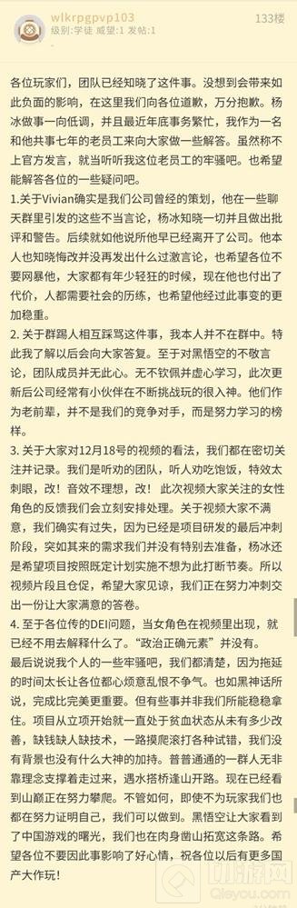 在NGA相关的讨论帖中,一位自称是内部人员的用户发文回应了此事。该用户表示Vivian已经离开了团队,且游戏本身并没有包含“政治正确”的元素。该用户希望玩家们不要因为这件事情而影响心情。不过,这段声明很快就被删除了。