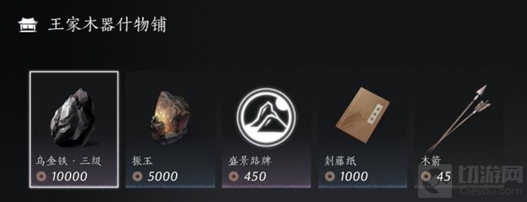 王修竹:该店铺位于王家木器什物铺,销售乌金铁(限购10)、振玉(限购20)和刻藤纸(用于易容玩法,日库存99)【宋元】。