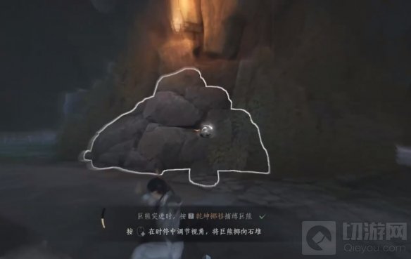 跳入石穴后,你将遇到厚皮白化黑熊。在战斗中,系统会引导你使用乾坤挪移技能。