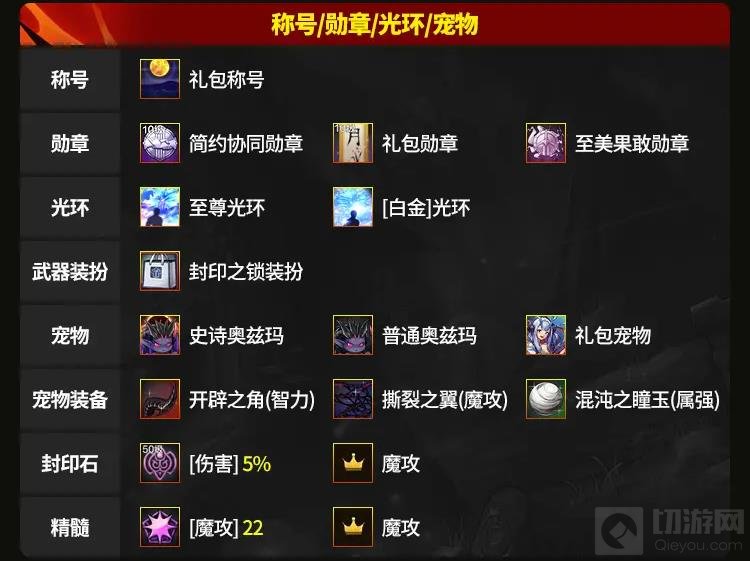 暗殿骑士的称号、勋章、光环和宠物选择主要以提升智力和魔法攻击力为主。以下是推荐的选项: