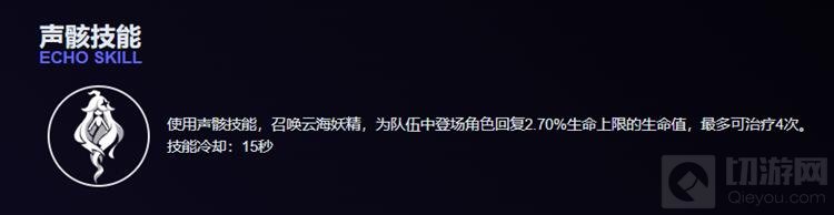 使用声骸技能,云海妖精可以为队伍中登场角色回复2.70%生命上限的生命值,最多可治疗4次,技能冷却时间为15秒。