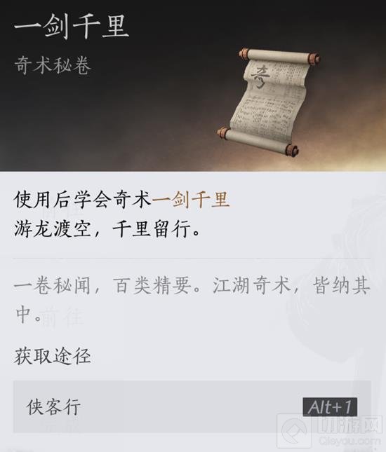 获得奇术秘卷后,学习该秘卷,即可学会“一剑千里”。
