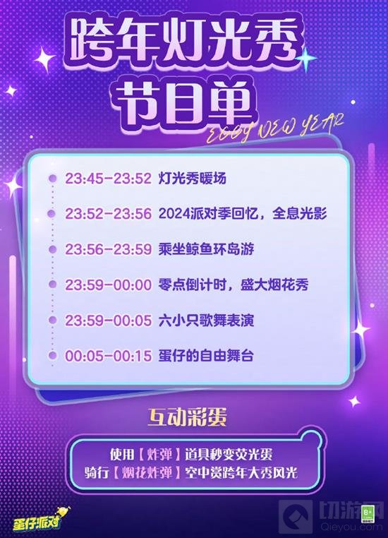 跨年灯光秀:一场视觉盛宴,以烟火和灯光交织出梦幻般的夜空,让蛋仔们在璀璨星光下共同倒数,迎接新年的到来。