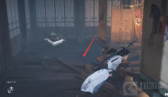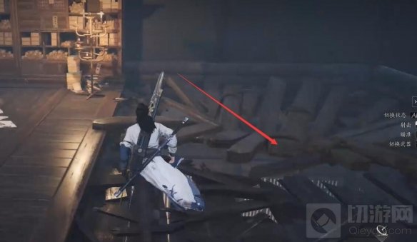 打碎碎木板:视角向后转,可以看到一堆碎木板,打碎它们然后跳进去。