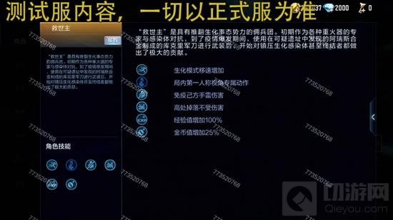 从救世主角色介绍上来看,与救世主模式的救世主有一丝不同。该救世主是一个佣兵团组织,最开始是使用重火力的专家,后来擅长使用特殊的军刀,但相同的是,两种救世主对生化幽灵都有极大的压制能力。该救世主有多个被动技能,除了经验值和金币有相应的增加外,还拥有四个较为有用的被动技能:一、生化模式移速增加。二、局内第一人称专属动作。三、免疫己方手雷伤害。四、高处掉落无伤害。从技能上来看比较平庸,仅在生化模式有些优势。