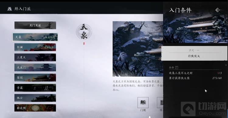 天泉入门条件为60侠义值和三个不义之财。侠义值通常通过完成支线任务获得,不义之财可以通过以下方式获取。