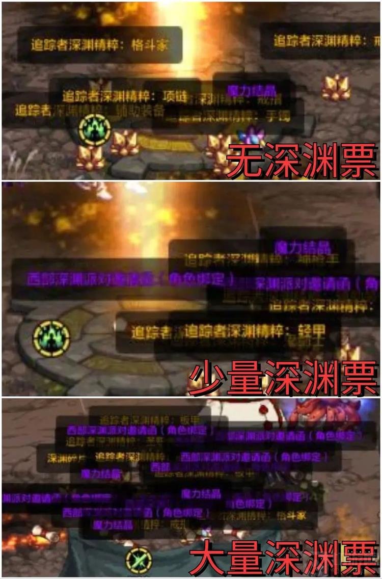 开始刷深渊派对时,先刷3~5把深渊,观察“西部深渊派对邀请函”掉落数量情况,建议“无深渊票掉落”次数多为宜。如果出现“保底进度条闪光”的情况,不要返回城镇,选择“再次挑战地下城”。“白柱子”和“黄柱子”掉落史诗武器概率更高,“黄柱+星斑”掉落套装史诗概率更高,是否“卡深渊柱子”由玩家自行决定。如果开局5~8把深渊既无闪光,又无保底进度条闪光情况,建议更换频道并重新选择角色继续深渊。