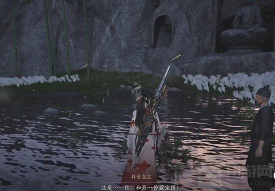 获取藏宝图线索一:在存放酒的货架上,找到使举味送出的藏宝图线索一。打开地图,根据指引来到标点位置,那里有一块河沟,旁边有个老翁在钓鱼.