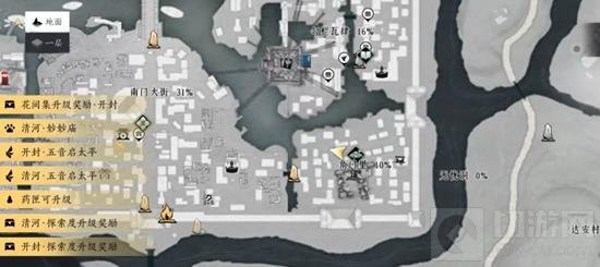 首先我们在游戏中,进入开封地图,然后打开地图,找到角门里。在角门里右边可以看见镇守顶上这片房屋区域。