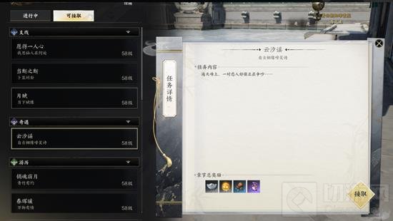 触发任务后,点击L查看可接任务列表,选择并接取【云汐谣】任务。