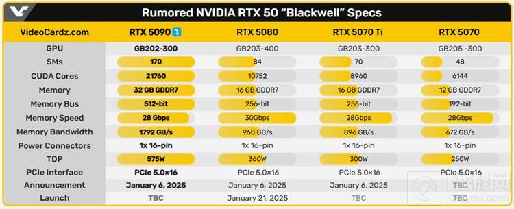 RTX 5090预计将使用GB202 GPU,并且将是RTX 50系列中唯一采用此处理器的型号。这款显卡预计会包含21,760个CUDA核心,热设计功耗(TDP)高达573W,相比前一代产品增加了125W。Nvidia预计将在拉斯维加斯举行的CES主题演讲中正式推出GeForce RTX 5090,时间定在北京时间周二(1月7日)凌晨。