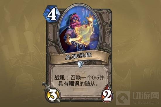 奥能铁匠:这张卡不适用于前期的场面争夺,通常不如森金持盾卫士。适合1到3费可以稳定压制场面的卡组,比如盗贼和类似动物园的术士、有武器的战猎等——在我方有主动权的情况下他可能比森金持盾卫士略好,不会被暗影打击或者闷棍、火球解光。盗贼拿他配合武器换掉邪灵拷问者还可以留下0/5嘲讽影响交换。他的优点也在于可以恶心挂起武器的战士和贼猎,配合各种buff以及火舌、恐狼、进化。用好这张卡需要一定的选牌技术和对竞技场的理解。风格偏快的牌手会更喜爱这张卡的。