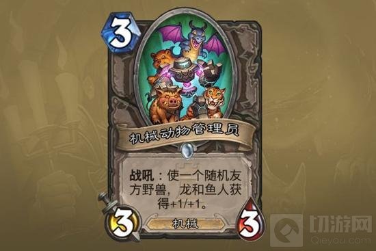 机械动物管理员:本身是机械,与机械跃迁者、地精炎术师等随从有机械配合。两费曲线除了猎人、德鲁伊的职业野兽之外也有相当多的常见可配合随从:如精灵龙、巨型蟾蜍和怒鳍猎潮者。这张卡不是非常的强大,但会成为ONK版本竞技场的3费中坚力量,改变2费随从的选择,也给2费有种族属性的随从带来了隐性嘲讽效果。由于可以buff多个随从上限不低。缺点在于直接打出会被3/4身材乃至4/4随从压制。