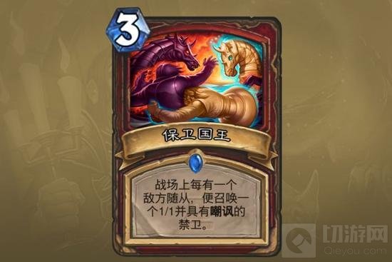 保卫国王:只有配合加固才能获得优势,但是加固在竞技场基本不拿。战士的思路是压制场面,130这样的卡都不会拿,何况这张。不同于关门放狗,对手对于如何处理这些嘲讽拥有主动权,更不用说吃各种aoe了。拿到手里基本等于手牌-1,宁可拿1费2/1白板也不拿这一张。