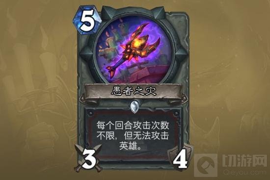 愚者之灾:5费提供类似双火球或者烈焰风暴的效果。提供无限的中期场面压制力,可以配合的卡非常多,不仅有这个版本的白卡紫罗兰法师,还有血帆袭击者等传统武器配合。小小的缺陷在于解一个4、5费随从要卖6到10血,因此会提高嘲讽随从和加血单卡的抓位。此外,这也提供了战士也很需求的补刀手段,因此这张卡没有理由不拿。按照字面说明,这张卡可以先砍完死亡之咬等武器再换刀解场,缓解了战士卡武器的问题。