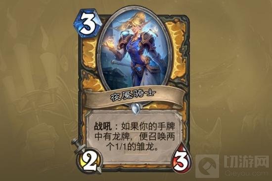 夜魇骑士:如果说麦迪文的男仆增加了法师卡组的强度下限,这张卡则降低了圣骑士的卡组下限。在这个没有新龙的版本,圣骑士又是一个返场羸弱的职业,3费让场面可能直接崩盘。卡组中已经有3条以上的龙可以考虑,但是触发了特效也不会特别强劲。