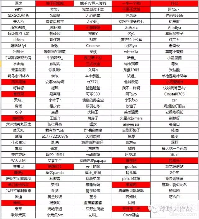 特别注意:名单中红色标注的玩家用户名不对哦,请及时到百度贴吧【球球大作战吧】找到贴子【庆周年庆送孢子活动获奖名单来啦!】用自己中奖的贴吧ID回复该贴正确的游戏用户名,方便给大家发放奖励哦!!!请在一周内回复并联系我们,逾期奖励就没啦!
