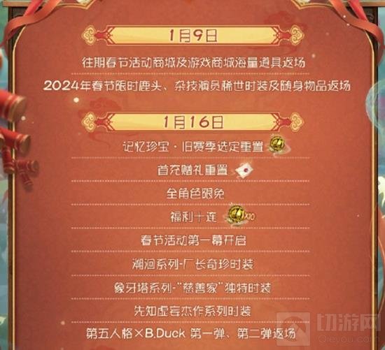 往期春节活动商城及游戏商城海量道具返场:2024年春节限时的鹿头、杂技演员稀世时装及随身物品将再次上架商城,错过上次机会的玩家可以趁此机会获取这些珍贵的道具.