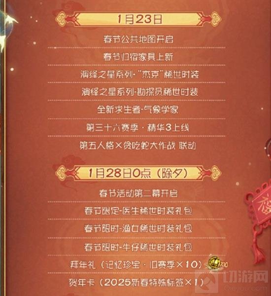以上就是第五人格新春版本活动的相关内容了,关注切游网,这里有最新的游戏资讯和全面的游戏攻略,你的支持就是我们更新的动力