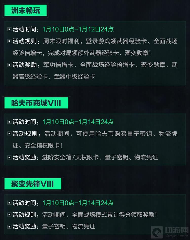 “聚变先锋Ⅷ”活动将于1月10日0点至1月14日24点进行。玩家在全面战场模式中累计得分即可领取奖励,包括量子密钥和物流凭证。