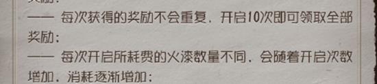 火漆消耗:每次开启所耗费的火漆数量不同,会随着开启次数的增加而逐渐增加,具体消耗数量需要玩家在游戏中查看.