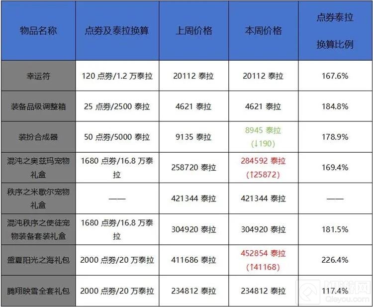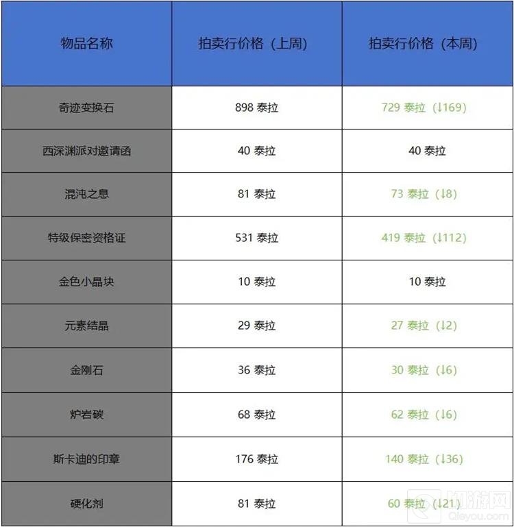 接下来,我们来看拍卖行道具的分析.截止到1月4日,搬砖材料价格出现了集体降价的趋势,除了西部深渊派对邀请函和金色小晶体这两样道具价格相对稳定外,其他材料都出现了不同程度的降价。这主要是因为新职业热度下降所导致的。不过,商城道具的价格却非常稳定,大部分道具都没有受到新职业热度下降的影响而降价。值得注意的是,夏日礼包在时隔几个月之后终于开始了大幅度的涨价,目前泰拉点券兑换比例已经达到了226.4%,早期屯夏日礼包的玩家可以小赚一笔了。