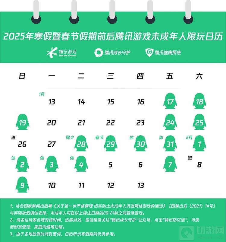 2025年1月底就是春节了,春节期间未成年人可以在哪些日子玩游戏?下面是2025年1月~2月初的未成年人限玩日历,我们一起来看看吧。