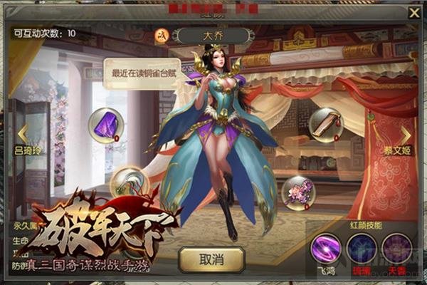 既然是乱世红颜,没有些许技能怎能成为英雄背后的力量,虽然美人可出现在场景中跟随玩家,但并不参与战斗,只能通过培养美人增强玩家的属性,提升玩家战斗力。美人的技能皆是针对主角,比如玩家最先获得的美人大乔,技能“飞鸿”就能使主角获得一定概率的减伤效果。更多红颜技能还需要玩家一一解锁,相信不论是外貌还是内在都不会让玩家失望。