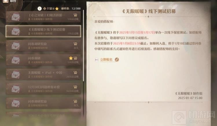 叠纸公司计划于2025年1月15日至1月17日举办这次线下保密测试,招募截止时间为2025年1月8日23:59。如果顺利入选,玩家将在1月10日通过问卷中填写的联系方式收到通知,并进行后续流程。