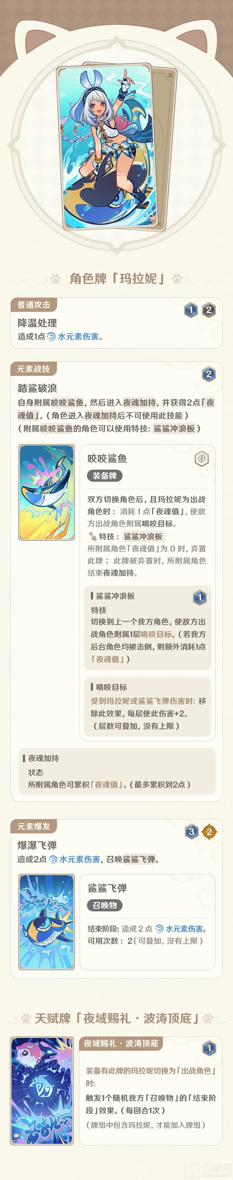 - 解析:咬咬鲨鱼是玛拉妮的控场核心,能够在敌方切换角色时对其施加负面效果,限制其行动。同时,特技“鲨鲨冲浪板”为玛拉妮提供了额外的战术选择。