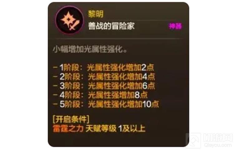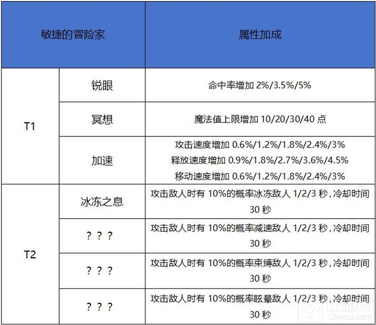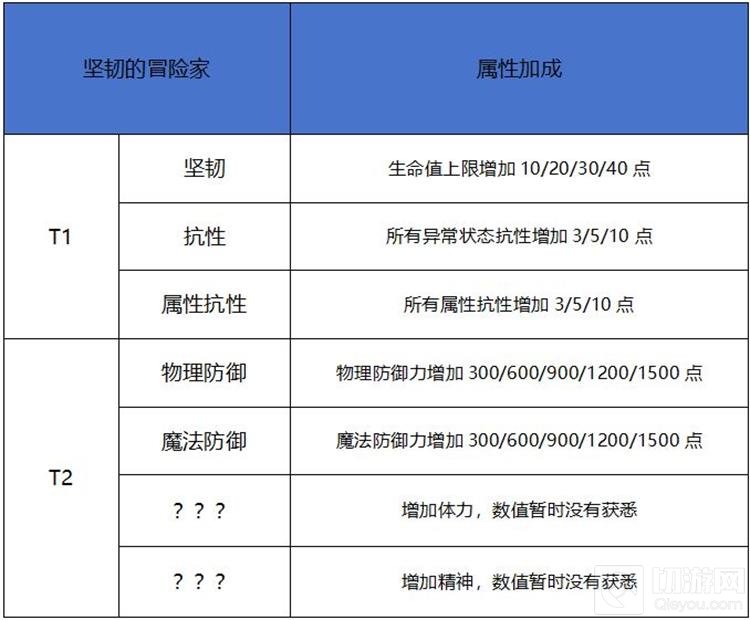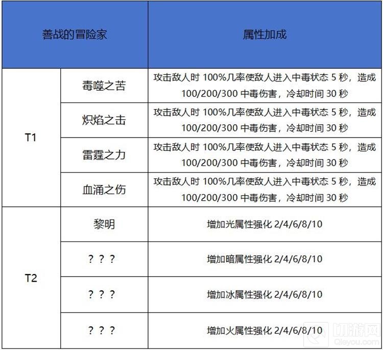 天赋属性分为善战的冒险家、敏捷的冒险家、坚韧的冒险家三类,每种天赋又可分为3至5个阶段。天赋梯度分为两阶,T1阶自动开启,而T2阶则需要玩家学习6个不同的1阶天赋,并至少消耗30个天赋点才会开启。