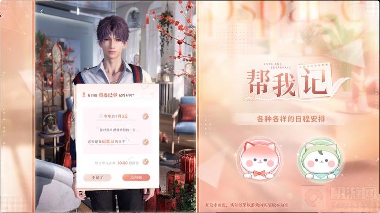 《恋与深空》3.0版本的【帮我记】陪伴系统不仅增强了游戏的互动性,还为玩家提供了实用的生活辅助功能。如果你对这个系统感兴趣,不妨在游戏中亲自体验一下,相信你会感受到各位男主无微不至的关怀。如果这篇攻略对你有帮助,还请点个收藏关注一下切游网,各位读者的支持就是我们持续更新的最大动力。