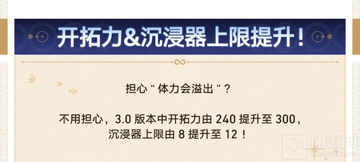 崩坏星穹铁道3.0版本担心“体力会溢出”?不用担心!3.0版本中,开拓力由 240 提升至 300,同时沉浸器上限由 8 提升至 12 。与此同时,后备开拓力的上限仍然保持2400不变。