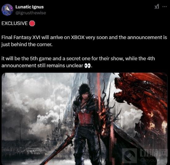 外媒tech4gamers消息,据业内人士Lunatic Ignus透露,《最终幻想16》可能将在2025年1月23日的Xbox开发者直面会上宣布登陆Xbox平台。