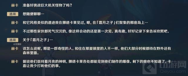 在NPC赫卡的对话中,提到了“霜月之子”这一神秘群体。他们崇拜月亮神明,制作冰雕,并且拥有使用魔法的能力。这些特征与丝柯克提及的力量以及玛薇卡所说的早于七元素的自然力量相呼应,为游戏中的元素体系增添了更多的层次。