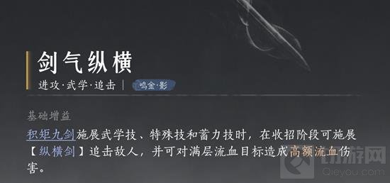 特点:剑气纵横提供强大的剑气攻击,易水歌和威猛歌增强连贯性和攻击力,燎原星火或极乐泣血为剑法带来不同的战斗效果。前者增加火焰伤害,后者在攻击时有几率触发特殊效果。