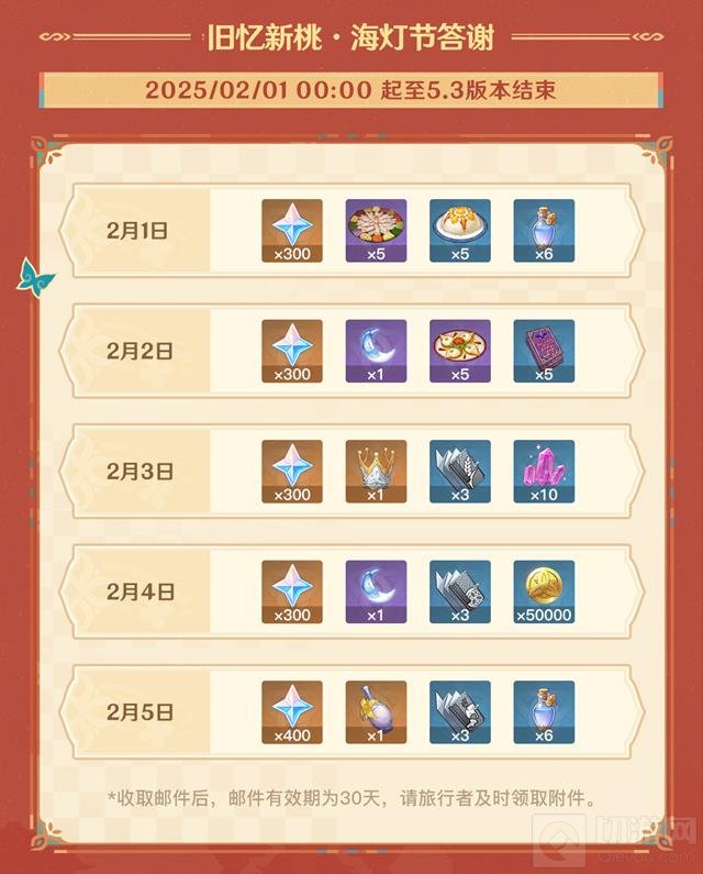 旧忆新桃·海灯节答谢:登录游戏可以在邮件中收获多种奖励,包括原石、经验书、摩拉等。